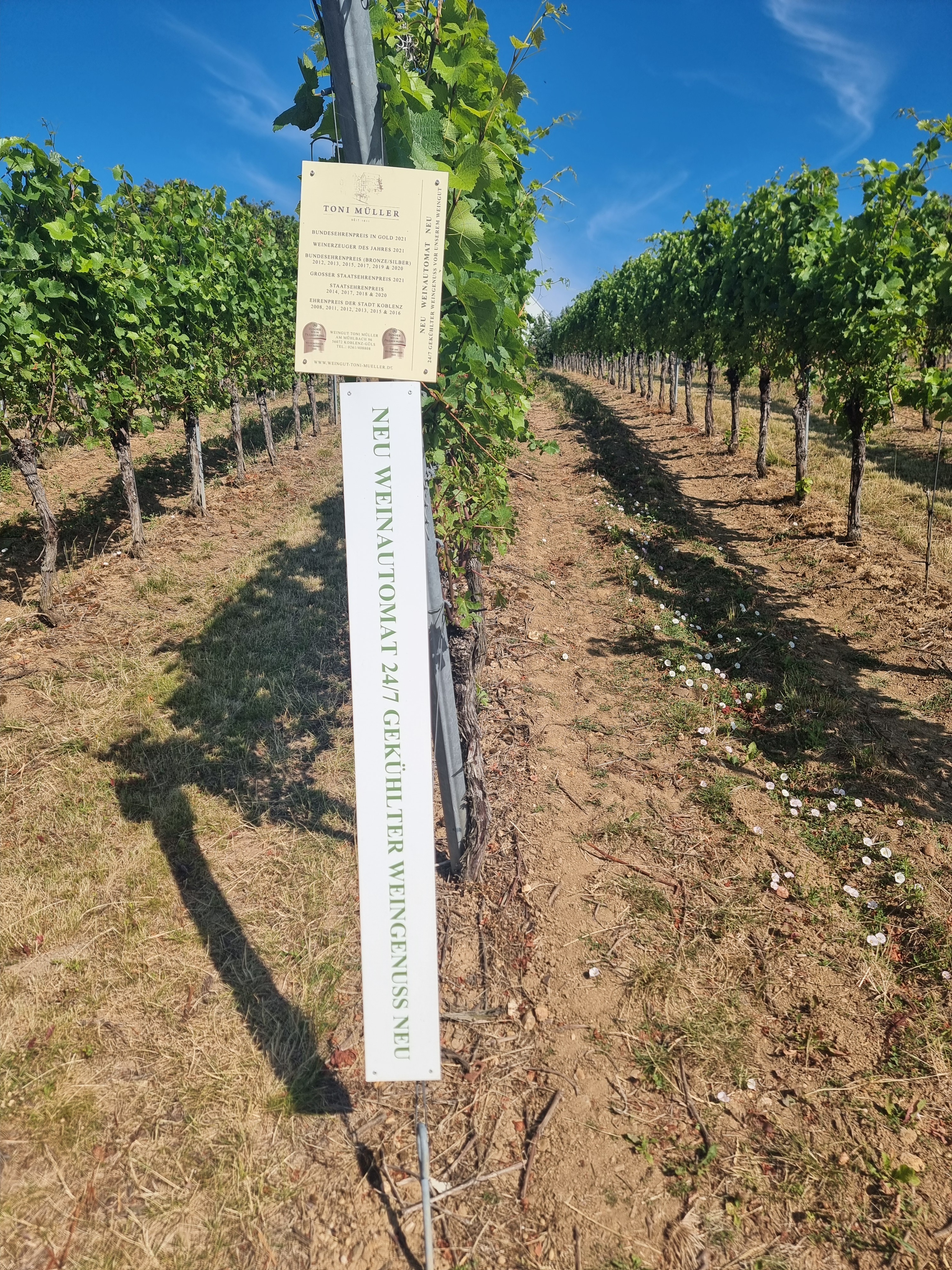 Nach dem Lärm und der Hektik der Raststätte wurde es schlagartig ruhiger. Der Weg führte nun mitten hinein in die Weinberge, vorbei an den Reitanlagen des Distelberger Hofes. Trotz der Nähe zu Winningen war es überraschend still. Kein Müll, kaum Menschen, nur Reben und Abendlicht.