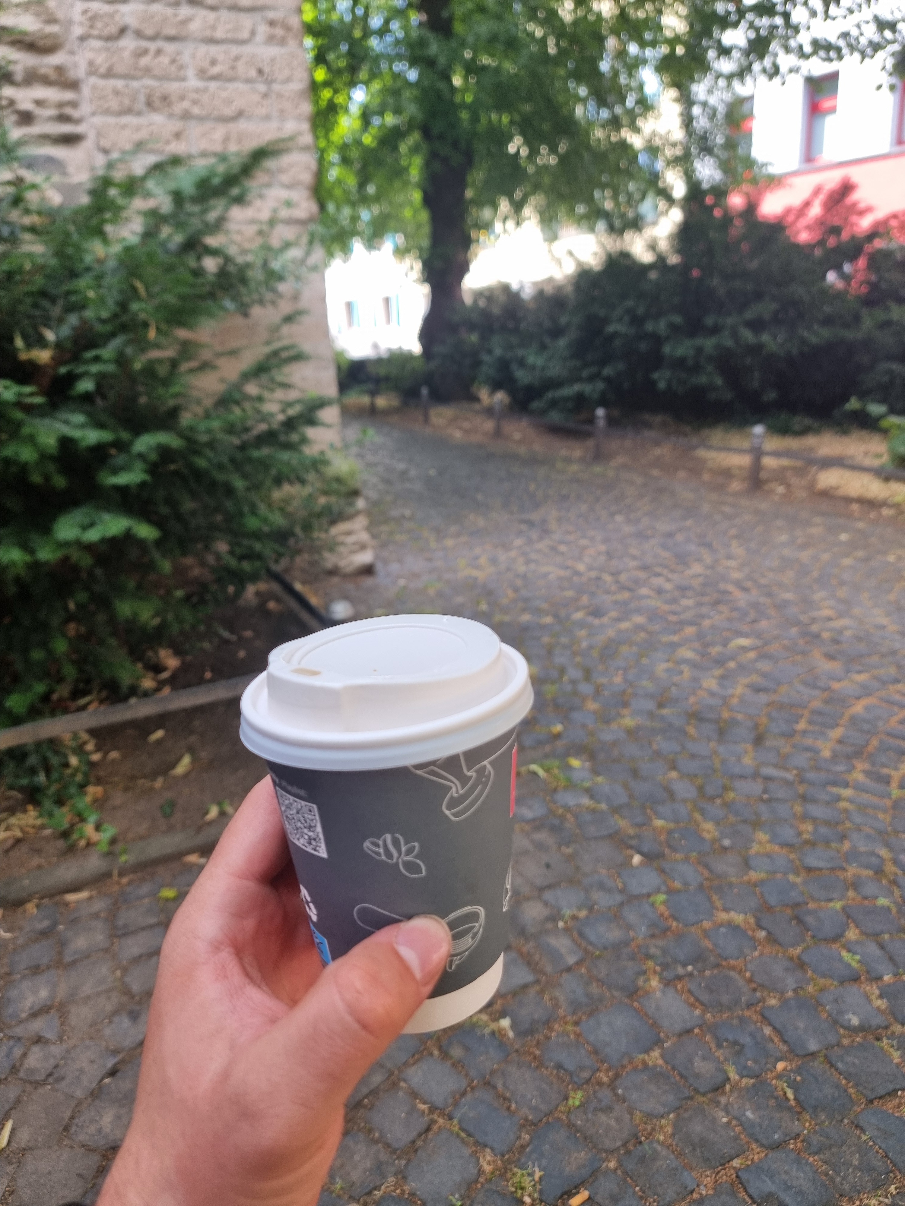 Der Trinkwasserbrunnen „Bassemer Bur“ hätte von dort noch einmal rund einen Kilometer Umweg bedeutet. Darauf verzichtete ich. Stattdessen setzte ich mich in einen kleinen Innenhof vor der Toilettenanlage und machte eine kurze Pause – inklusive „Camel up“.