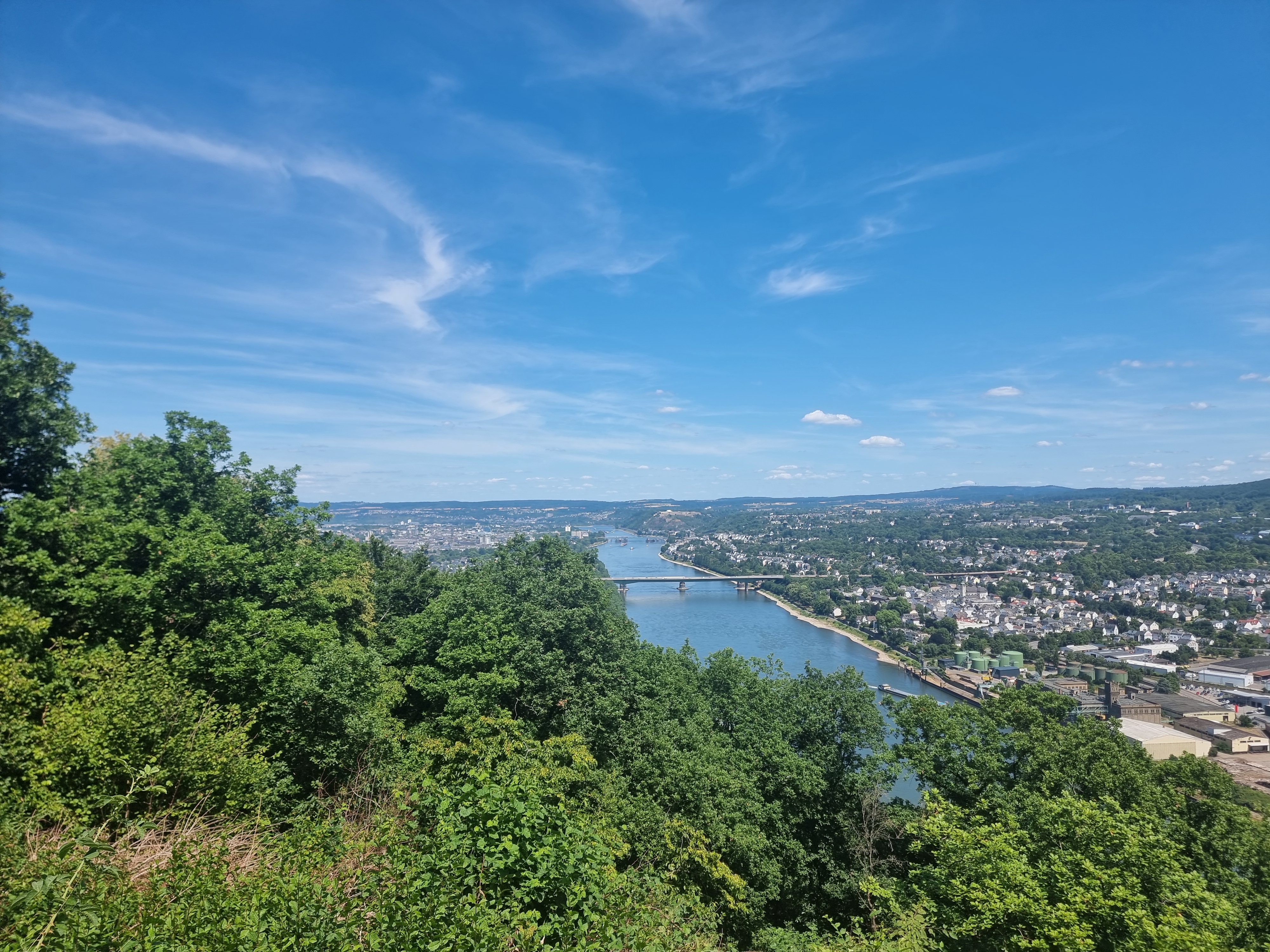 Nach rund zwei Kilometern und etwa 20 Minuten erreichte ich die Dommelberghütte. Endlich eine Aussicht, die ihren Namen verdient: Blick auf Lahnstein und die rechtsrheinischen Stadtteile von Koblenz.