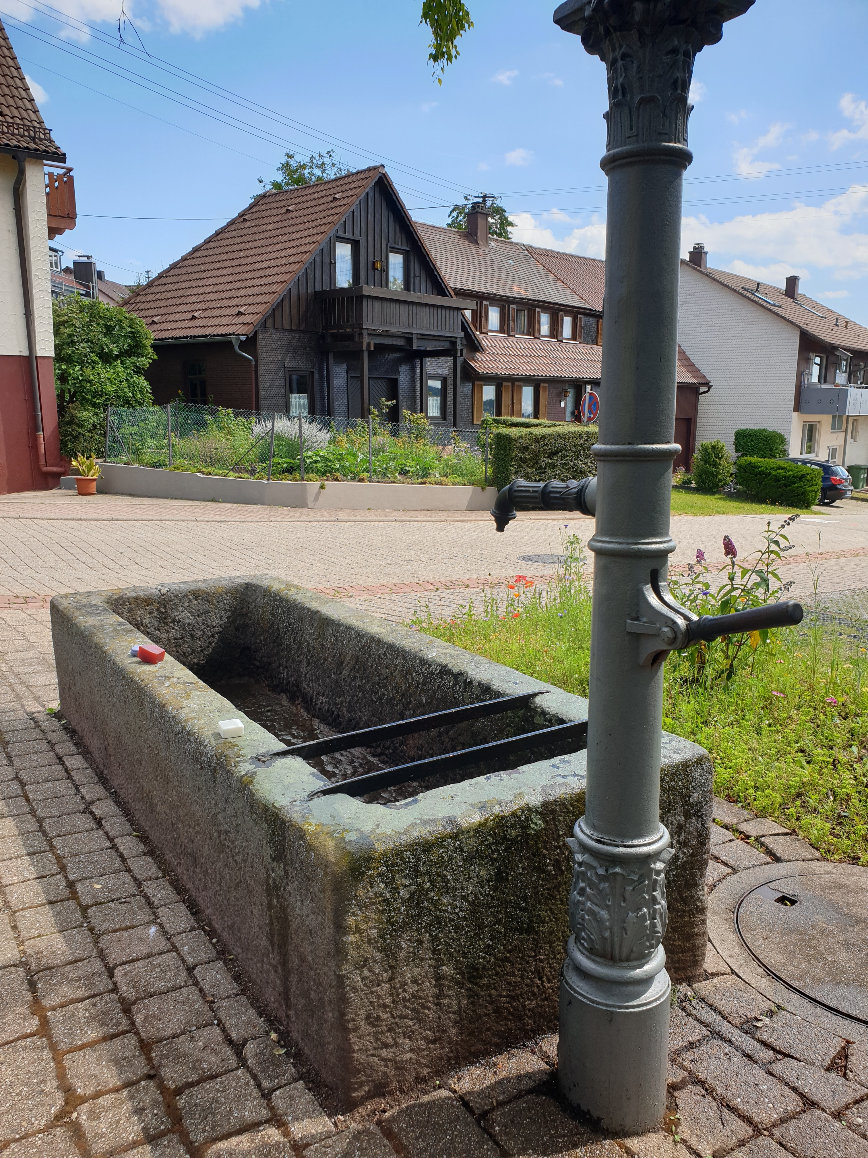 Jedoch empfehle ich, den Weg Richtung Südwesten zu nehmen. Nach einem kurzen Abschnitt bergab geht es auf der Wildbader Straße weiter in westlicher Richtung bergauf, bis man an einem Trinkwasserbrunnen mit einer Sitzgelegenheit ankommt. Dieser Ort eignet sich hervorragend für eine Pause und eine Auffrischung der Wasservorräte. Ein Baum spendet wohltuenden Schatten, und wer mit mehreren Personen unterwegs ist, kann das Gepäck ruhig dort lassen, während jemand zur nahegelegenen Straße „Dorfwiesen“ geht, um beim örtlichen Laden einzukaufen. Das lohnt sich jedoch nur, wenn man noch bis Forbach etwas benötigt. Andernfalls ist es besser, in Forbach direkt am Westweg und am Bahnhof einzukaufen.
